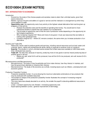 notes explaining the entire semesters worth of content. notes were made in preparation for the end of semester exam topics include - Introduction to Economics - Market Forces - Elasticity - Cost of Production - Market Power - Oligopoly and Externalities - GDP And Economic Growth - Unemployment and Inflation - Aggregate Demand and Aggregate Supply - Monetary Policy - Fiscal Policy