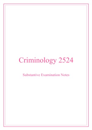 These are substantive examination notes, collated and structured into comprehensive paragraphs throughout the semester. Additional discussion material has been added which is not included in the course, but will allow different perspectives to be taken in essays and in the exam ( Flint water crisis and its relation to nutritional criminology, The Three Identical Strangers documentary and its relation to the twin nature vs nurture documentary, Sara Gross and the influence of mental illness on her crimes.) The following topics are included; - Pre-Classicalism Theory - Classical Theory - Neo-Classicalism Theory - Early Positivism - Eugenics - Biological Positivism (Eugenics and The Jukes Study) - Mental Illness - Psychopaths - Cultural Criminology Theory - Critical Criminology Theory - Anomie and Strain Theory - Sex Work - Capital Punishment Police, Moral Panics and Dark Figures are not included as they were not examinable in 2018.