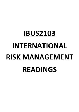 High quality notes that clearly, concisely and comprehensively outline all of the IBUS1102 readings for the entire semester. These notes supplement the remainder of the course content and are necessary for final exam as well as the weekly tutorial quizzes. Contains any relevant diagrams from each of the notes. Include readings for all topics from weeks 1 to 13: - A framework for international risk management - Risk analysis: business vulnerability - Risk analysis: political and regulatory - Risk analysis: economic - Risk analysis: social - Risk analysis: environmental - Risk analysis: technological - Risk analysis: disruptors - Risk management systems (1 and 2)