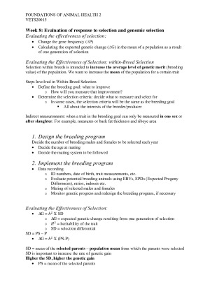 These notes are a fantastic opportunity to gain a very thorough understanding of FAH2 content. In-depth explanations of difficult lecture content, workshop and guest speaker summaries and step by step calculations are all included to help you achieve the best mark possible. Brief explanations presented in lectures are expanded on in these notes to aid in your understanding. Topics covered are: - Week 1: Introduction to Animal Welfare - Week 2: Housing of Animals and Behaviour - Week 3: Measurement of Animal Welfare - Week 4: Environmental and Social Group Effects on Animal Welfare - Week 5: Husbandry Practises, Management and Regulation - Week 6: Introduction to Animal Breeding and Quantitative Genetics - Week 7: Mating Systems - Inbreeding and Crossbreeding - Week 8: Evaluation of responses to Selection and Genomic Selection - Week 9: Introduction to Infectious Agents - Week 10: Sub-clinical Disease and treating Disease - Week 11: Interactions of Infectious Agents and Preventing Disease - Week 12: Zoonoses and Regulation of Disease Control and Prevention