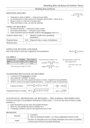 Clear, neat and detailed summary notes from Semester 2, 2018 for investments. Notes are in dot point form with all relevant information included. Also include diagrams, examples and all equations. Topics: - Modelling risk and Return - Portfolio Theory - Optimal Portfolio Choice - CAPM - Single Index Models - Portfolio Performance Evaluation - Fixed Income Valuation - Fixed Coupon Bonds - Term Structure of Interest Rates (TSIR) - Managing Fixed Income Portfolios - Floaters and Interest Rate Swaps