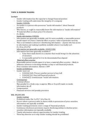 Semester 2 2018 Australian Company Law Exam Notes Examinable Content: Lectures and Readings from Week 9 - Insider Trading - Company Management - Directors Duties - Insolvent Trading