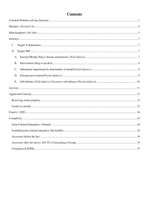 I got an HD in the final exam and overall D mark. - A very helpful structure for the final exam. - Designed every step to answer the Problem-solving question in the final exam. - Covered all the topics that would be tested in the exam. - Used pretty helpful tables and flow charts to help u have a better picture of what u learned in Criminal Law - ONLY 19 Pages(Colored and Detailed)
