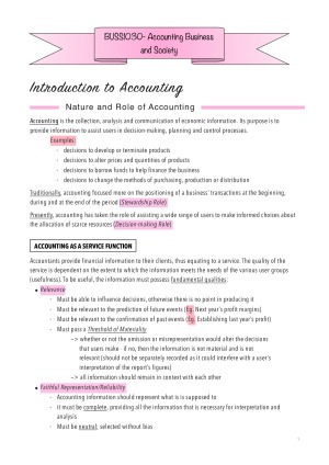 A complete and intensive summary of the course combining content from textbooks, tutorials and lectures. Topics: - Introduction - Measuring & Reporting Financial Positions - Recording Transactions - Accounting systems and Internal Control - The statement of Financial Performance - Statement of Cash Flows - Financial Ratios -Cost-Volume-Profit Analysis - Full Costing - Budgeting