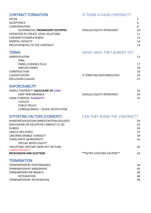 Comprehensive and condensed exam notes - ALL YOU WILL NEED Topics include: - Contract formation - Terms - Enforceability - Vitiating factors - Termination Pages are numbered, notes are colour coded, rules are clearly highlighted in pink boxes, cases are coloured green and have a brief explanation of facts/findings, all elements set out clearly.