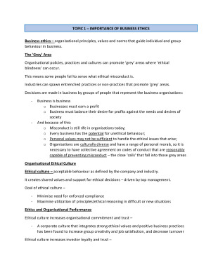 Comprehensive and detailed notes for ALL topics - - Topic 1: Importance of business ethics - Topic 2: Stakeholder relationships, social responsibility and corporate governance - Topic 3: Emerging business ethics issues - Topic 4: Ethical decision making - Topic 5: Moral philosophies - Topic 6: Organisational factors - Topic 7: Developing an effective ethics program - Topic 8: Institutionalisation of business ethics - Topic 9: Business ethics in a global environment - Topic 10: Ethical leadership I have cut-down all the lecture and textbook content to give you only the information you need to get a great mark. Each topic has been compressed to 1 - 3 pages only! Easy to read with clear headings. There is also a list of practice/revision questions (based on tutorial content and practice exams) at the end of the notes to really help you do well in the exam!
