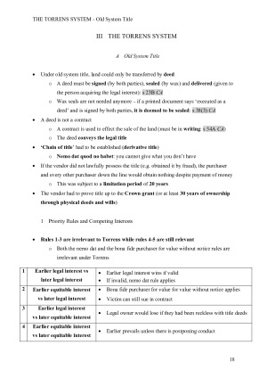 Very high quality, comprehensive, easy to understand Land Law notes. Notes were made from classes taught by Cathy Sherry. Features include: - clear language - logical structure - relevant legislation extracted in text boxes - all important cases briefed in tables (outlining facts, issue, held) - key words bolded to allow for easy skimming in an exam - important policy points included - recent 2018 cases included - ACLG style headings - level 1 and level 2 headings included in page headers for ease of reference Topics include: - Native Title - Fundamental Concepts in Land Law - The Torrens System - Indefeasibility - Caveats - Co-Ownership - Leases - Mortgages - Easements - Freehold Covenants