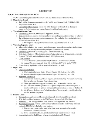 Using these notes, I achieved a HD in LDR in the exam, and the unit overall. This set includes my exam summary notes and policy notes on class actions. Topics covered: 1. Introduction 2. Disputes and the Civil Justice System 3. Jurisdiction 4. Multiple Parties and Joinder of Claims 5. Commencing proceedings, service and appearance 6. Defining the Issues in Dispute 7. Methods of Gathering Evidence 8. Disposition of Disputes 9. Costs 10. Class Actions (Policy only) Please note the summary notes do not include ADR (topic 3), as this was the focus of our assignment. ADR is covered in detail in my long form notes.