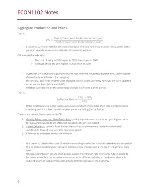 Notes covering the ENTIRE ECON1102 course, including the final exam. Received a High Distinction with a final mark of 85 for this course. Covers ALL course topics including: Measures of Macroeconomic Performance: Output and Prices Saving, Wealth and the Real Interest Rate Unemployment and the Labour Market Business Cycles The AE Model of Output Determination Fiscal Policy The Financial System, Money, Prices and the RBA Monetary Policy The AD-AS Model of Output and Inflation Macroeconomic Policy Exchange Rates Capital Flows Economic Growth
