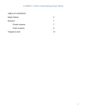 Areas covered: - Safety Defects - Nuisance (private and public) - Trespass to land My approach to exams is to enter as pre-prepared as possible. My notes are in a format that will allow you to fill in the blanks with the facts after reading the exam question. They are structured so that you will cover everything required in each question, as well as different possible answers. They are also as short as possible, to save you wasting precious exam time flipping though pages. It is recommended that you use these notes to form the basis of your own exam notes.