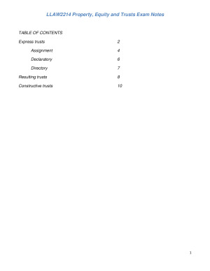 Areas covered: - Express trusts (assignment; declaratory; directory) - Resulting trusts - Constructive trusts My approach to exams is to enter as pre-prepared as possible. My notes are in a format that will allow you to fill in the blanks with the facts after reading the exam question. They are structured so that you will cover everything required in each question, as well as different possible answers. They are also as short as possible, to save you wasting precious exam time flipping though pages. It is recommended that you use these notes to form the basis of your own exam notes.
