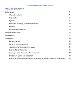 Areas covered: Oral evidence: - Character evidence - Propensity - Opinion - Unreliable testimony (ID and corroboration) - Hearsay - Admissions/confessions Documentary evidence Real Evidence Essay topics: - Burden of proof - Common law presumptions - Assessment of damages in tort cases - Examination of the witness - Court's power to dispense with formal proof - Undercover agents and entrapment - Derivative evidence which confirms involuntary or unlawfully obtained confessions My approach to exams is to enter as pre-prepared as possible. My notes are in a format that will allow you to fill in the blanks with the facts after reading the exam question. They are structured so that you will cover everything required in each question, as well as different possible answers. They are also as short as possible, to save you wasting precious exam time flipping though pages. It is recommended that you use these notes to form the basis of your own exam notes.