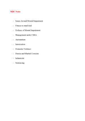 These notes cover all lectures, tutorials and reading from weeks 1-12. Case summaries for the most important cases are included. Topics covered include: - Issues Around Mental Impairment - Fitness to stand trial - Defence of Mental Impairment - Management under CMIA - Automatism - Intoxication - Domestic Violence - Duress and Marital Coercion - Infanticide - Sentencing