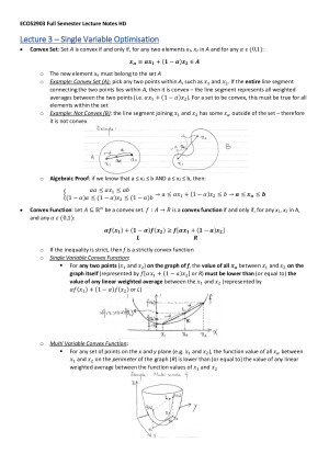Complete semester's worth (11 lectures) of high-quality, HD notes including all relevant proofs, graphs and detailed explanations of new concepts. Topics include: functions, differentiation, single-variable optimisation, integration, functions of many variables, matrix algebra, concavity, convexity, determinants and inverses, unconstrained optimisation, constrained optimisation (with both equality and inequality constraints) This subject is very difficult and requires a lot of hard work with practice questions, but these notes give a solid foundational basis to work upon - extra care has been taken whilst writing these notes to ensure this.