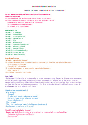 Course notes from the entire semester of PSYT3000 Abnormal Psychology. Includes notes from lecture, tutorials, and assigned readings, organised by week. Are 'colour-blocked' for ease of reading and studying. Received distinctions and high distinctions on all assessments and an overall mark of 83% in this unit. Topics covered include: introduction/defining disorders/case formulation, anxiety disorders/PTSD, depressive disorders/bipolar disorders, feeding and eating disorders, obsessive compulsive and related disorders, schizophrenia and psychotic disorders, personality disorders, substance-related and addictive disorders, childhood disorders, intellectual disability, autism spectrum disorders, and sexual dysfunctions/paraphillic disorders.