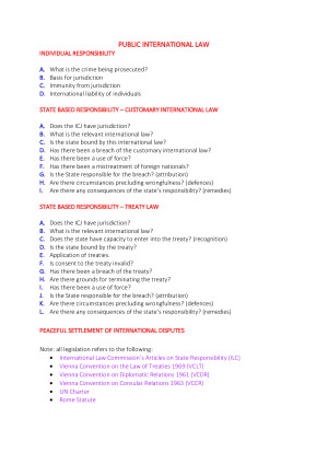 An easy to follow, step-by-step guide to answering final exam problem questions. Topics included are outlined in the first page of the preview. Broadly, topics include: Individual Responsibility State Based Responsibility - Customary International Law - Treaty Law Peaceful Settlement of International Disputes