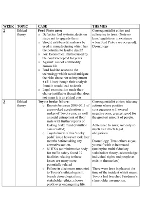 These notes cover the weekly topics discussed throughout MGX3100; Topic 1-2: Ethical Theory Topic 3: Shareholder Theory Topic 4: Stakeholder Theory Topic 5: Regulation Topic 6: Paternalism Topic 7: Corporate Governance Topic 8: Environment Topic 9: Sustainability Topic 10: Human Resource Management Topic 11-12: Marketing They provide both detailed outlines of the ethical theories covered along with case examples from each week with links back to the theory in which you can draw on when completing the final examination. These notes allowed me to have easily summarised notes of every topic in which I was able to draw upon when completing the final examination. This allowed me to score a HD for the unit and I believe they can do the same for you.