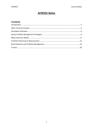 Here I have provided lecture notes that the mid semester test and the final exam are based off. I have made them clear and concise to prevent information overload. The more important topics (I found) were Black-Litterman and Portfolio Performance Measurement. Going over those topics in my notes will serve you well. Topics covered: - Introduction - Mean Variance Analysis - Parameter Estimates - Market Efficiency - Equity Portfolio Management Strategies - Black-Litterman Model - Portfolio Performance Measurement - Bond Valuation and Portfolio Management - Futures