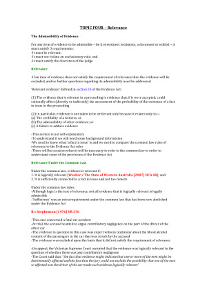 Evidence Law is a complicated area that requires good note preparation in order to do well in the unit. These notes provide a great summary of all case law and legislation in order for you to do as well as you can. The exam involved questions that required the application of multiple topics in one answer, so having these notes will be extremely beneficial. Contents of these notes: -Topic One - Introduction -Topic Two – Verbal Evidence -Topic Three – Documentary Evidence and Other Evidence -Topic Four - Relevance -Topic Five – Hearsay -Topic Six – Admissions -Topic Seven – Opinion -Topic Eight – Tendency and Coincidence -Topic Nine – Credibility and Character -Topic Ten – Privileges -Topic Eleven – Discretions