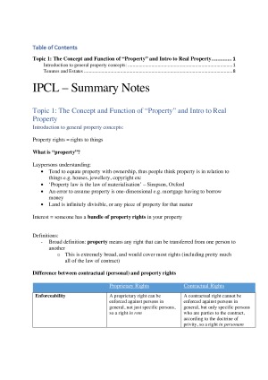 Covers all topics in course. Includes commentary from class, slides and textbook. Topic 1: The Concept and Function of “Property” and Intro to Real Property 2 Introduction to general property concepts: 2 Tenures and Estates 9 Native Title 14 Legal and Equitable Interests in Land 18 Process for proving property rights in relation to land 20 Old System and Torrens Title 28 Topic 2: Introduction to Choses in Possession 32 Taxonomy: 33 Identifying legal interests in choses in possession 34 Concept of delivery: Gamers Motor Centre 37 Transferring ownership through losing and finding 37 Transferring ownership by gift: Inter Vivos 39 Donatio mortis causa – gift on account of death 41 Transferring ownership – by sale (under Sale of Goods Act 1923) 42 Working out when there is such a contract sale of goods 44 Giving effect to the terms of the contract: 45 When does property pass under a contract of sale? 46 Engaging in dealings in choses in possession: transferring possession by bailment 49 Is there a bailment? Concept of bailment: categorisation? 50 Topic 3: Personal Property – Introduction to Choses in Action 54 What is a chose in action? 54 Taxonomy of personal property 55 Identifying a chose in action 55 Assignability 58 Equitable choses in action 67 Trust v Agency 70 Trust v Contract 71 Creating the trust: certainty of intention to create a trust 72 Interest under the trust 73 Suggest Structure 74 Interest in unadministered deceased estates 75 A Livingston right 75 Topic 4: Assignment and Disposition of Interests 80 Topic 5: Priority Regimes 101 Priorities under Sale of Goods Act 101 General law priority rules: Contests between legal and Equitable Interest 108 Prior equitable; subsequent legal 110 Priorities between equitable interests 113 Topic 5B: Commercial Dealings as Security Interests over Property 119 Suggest analytical framework 121 Types of Security Interest over Personal Property 122 Property definitions: s 10 123 Definition of a security interest 124