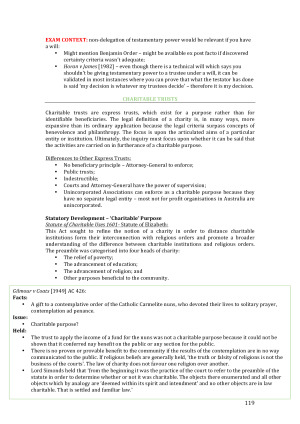 These notes are a combination of lectures and readings from the textbook Equity and Trusts by Samantha Hepburn. They also include useful exam 'roadmaps' which are helpful for answering questions. They cover the following topics: - The origins and nature of equity and its relationship with the common law; - Fiduciary relationships; - Equitable remedies - constructive trusts and tracing; - Equitable remedies - specific performance and injunctions; - The nature of a trust; - Beneficiary and trustee rights and powers; - Statutory formalities and complete constitution of express trusts; - Certainty requirements for express trusts; - Charitable trusts;