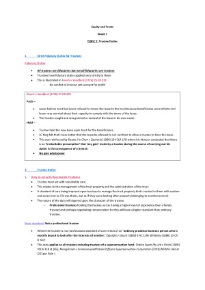 These notes were all I used to get a HD in the Equity and Trusts exam in T1 2018. They comprise notes from: - Lectures - Textbook - Extra readings - Cases and legislation - Study guide They are very detailed and have everything you need to know for the exam, and all of the key principles are highlighted and colour coded. The thorough and detailed, yet clear, case summaries from my reading of all of the prescribed cases will save you a lot of time throughout the semester. My notes include ALL examinable topics taught in T1 2018: 1. The Origin and Nature of Equity and its Relationship with the Common Law 2. Undue Influence and Unconscientious Dealing 3. Fiduciary Relationships and Fiduciary Duties 4. Fiduciary Remedies 5. Equitable Remedies: Injunctions and Specific Performance 6. Nature of a Trust 7. Trustee Duties 8. Statutory Formalities 9. Certainty Requirements for Express Trusts 10. Charitable Trusts