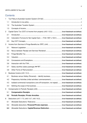 Topics: 1. tax policy& AU tax system 2. capital gain tax 3. income from services & Fringe Benefits tax 4. business income 5. compensation & periodic receipts 6. deductions 7. cost recovery: depreciation & trading stock 8. entity 9. international taxation 10. tax administration 11. ethics& avoidance 12 GST Includes all cases and problem questions& solutions