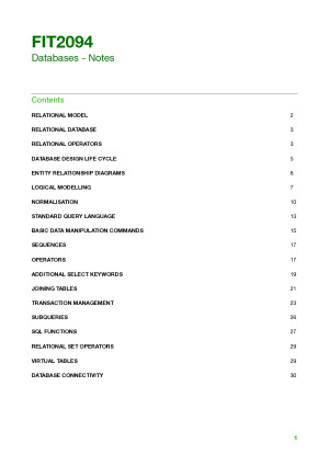 This extensive set of notes covers the entire FIT2094 syllabus and includes practice questions and answers. The information from these notes is sourced from both the 2018 lecture and tutorial slides and the Database Systems textbook. These notes cover the following topics: - Relational Model - Relational Database - Relational Operators - Database Design Life Cycle - Entity Relationship Diagrams - Logical Modelling - Normalization - Standard Query Language - Basic Data Manipulation Commands - Sequences - Operators - Additional SELECT Keywords - Joining Tables - Transaction Management - Subqueries - SQL Functions - Relational Set Operators - Virtual Tables - Database Connectivity