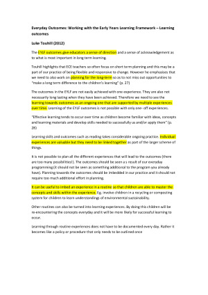 highlighted comprehensive notes on the required readings for eche220: EYLF, NQS, NQF curriculum and pedagogy approaches approaches to the EYLF Assessing the quality of EC services emergent teaching.