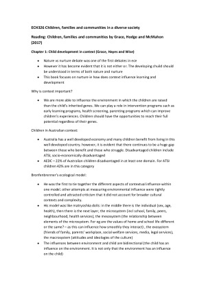 here are some notes on the required readings for ech326. Reading: Children, families and communities by Grace, Hodge and McMahon (2017) -Chapter 1: Child development in context (Grace, Hayes and Wise) -Chapter 14: Early education and child care policy in Australia (Brennan & Adamson) -Chapter 6: family as the primary context of children’s development (Mc Mahon an Camberis) Chapter 5: Cultural belonging and being at home in Australia (Lawrence, Brooker and Dodds)