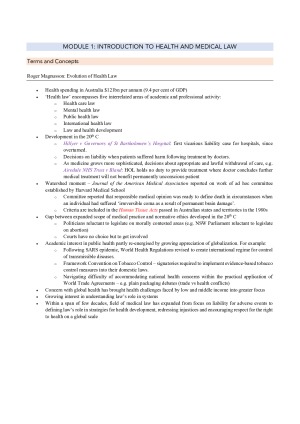 Very detailed set of summary notes covering the entire course. Includes notes on all cases and prescribed readings. Notes includes the following topics: - Module 1: Introduction to Health and Medical Law - Module 2: Consent to Medical Treatment - Module 3: Professional Liability - Module 4: Reproduction - Module 5: Withdrawal of Treatment, End of Life and Assisted Dying