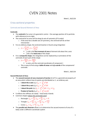 Notes cover all topics of the CVEN 2301 course (equivalent to ENGG 2400) in a week-by-week layout with detailed explanations, diagrams and formulae, taken from the textbook and tutorial problem sets Topics included: - Properties of Cross Sections - Concept of Stress - Concept of Strain - Mechanical Properties of Materials - Hooke's Law - Axial Force and Compatibility - Elastic/plastic/inelastic bending and Composite Sections - Beam deflections and Indeterminate Beams - Shear stress, flow and centre in beams - Torsion