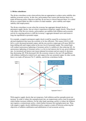 Responses to long-answer type questions, incorporating concepts from multiple weeks into the answers. Uses diagrams to easily explain concepts. Got an HD for this subject and these example responses I created really helped me to develop a better overall understanding of the subject and answer the exam questions effectively. Covers: (1) Divine coincidence (2) Self-correcting mechanism (3) Activist vs non-activist (4) Time inconsistency problem (5) Policy rules vs discretion (6) Keynesian liquidity preferences