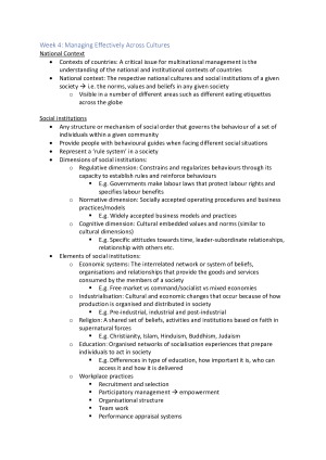 Concise notes based off lectures and readings Got an HD for this unit Covers: (1) Introduction/Management Challenges (2) Ethical issues (3) Cultural dimensions (4) Managing effectively across cultures (5) Cross Cultural Communication (6) Cross cultural conflict and negotiation (7) Strategy, structure and control (8) Motivation (9) Leadership (10) International HRM and teams