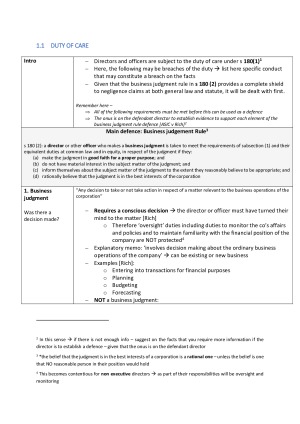 H1 Corporations Law Exam Notes Completed in 2017 Topics: - Director Duties: - who owes duties - duty to act in good faith - duty to act for a proper purpose - duty of care - loyalty - Shareholder Action: - Exercise control rights or reserve powers - Derivative Action - Oppression - Winding Up - Capital Maintenance - Issue of shares - Dividends - Reduction in capital - Financial Assistance - Corporate liability - Corporate Capacity