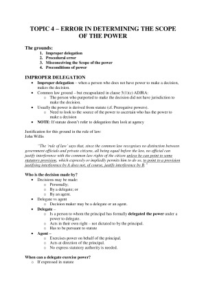 HD QUALITY ADMINISTRATIVE LAW NOTES. I relied on these notes exclusively to achieve my HD. The notes include in depth case summaries, digestible tables and processes, and a thorough discussion of each topic. Topics included: Topic 1: Introduction Topic 2: Sources of Judicial Review and Standing Topic 3: Grounds of Judicial Review (Procedural Fairness) Topic 4: Error in Determining the Scope of the Power Topic 5: Improper Exercise of Power Topic 6: Judicial Review Remedies Topic 7: Limitations (Justiciability) Topic 8: Tribunals and Merits Review Topic 9: Ombudsman and Information Disclosure Note: I completed this subject last year when it was coded as MLL324
