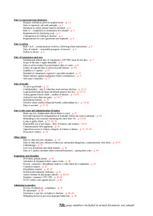 Comprehensive ethics problem question and essay exam notes. Every single duty, obligation and liability which is covered in this course is detailed, along with the relevant case law and legislation. These notes are ordered into a step-by-step scaffold, with key ratio from relevant case law and key phrases from legislation color-coded for ease of reference in the exam. Page 50 and beyond are ethics essay notes. The essay content for this subject is divided into 'the sociology of legal ethics', which is more theoretical, and essay content related to specific duties. This is also how the textbook orders the content (separated into two parts: sociology of ethics & duties) so i have done the same with my notes for ease of reference.