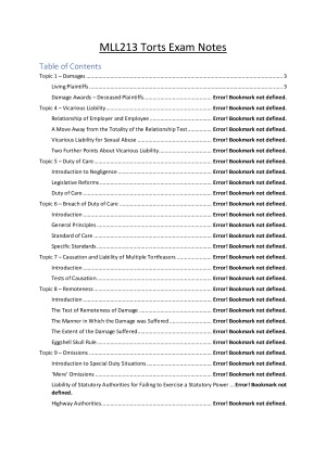 Received 78% on the exam with these notes (distinction) and a mark of 72 in this subject overall. Contains table of contents, notes on topics 1 through 11, page numbers referencing to textbook, relevant cases and legislation.