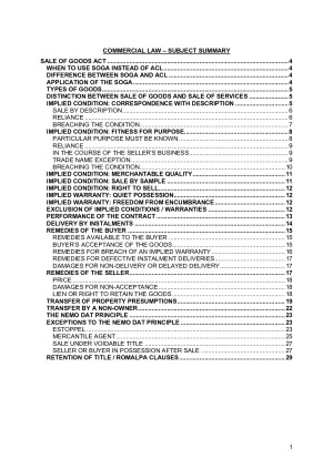 Complete HD summary covering the entire Commercial Law subject from beginning to end, including ALL relevant legislation and authorities for assignments and final exam. This summary incorporates notes from the required readings, additional readings and seminars. Commercial Law is a content-dense subject so a perfect, concise set of notes is exactly what you need to ace the subject! Sale of Goods Act - When to use SOGA instead of the ACL - Application of the SOGA - Implied conditions - Implied warranties - Exclusion of implied conditions / warranties - Remedies available to the buyer - Remedies available to the seller - Transfer of property presumptions - Transfer by a non-owner - The nemo dat principle - Exceptions to the nemo dat principle - Retention of title / Romalpa clauses Australian Consumer Law - Unfair contract terms - Unconscionable conduct - Product liability - Consumer guarantees Bailment - Requirements of bailments - Sub-bailments - Categories of bailment - Duties of all bailments Personal Property Securities Act - When does the PPSA apply? - The creation of security interests - Priority of security interests - Enforcement of security interests International Aspects of Commercial Law - Proper law of contract - Appropriate forum to hear disputes - UN CISG - Incoterms