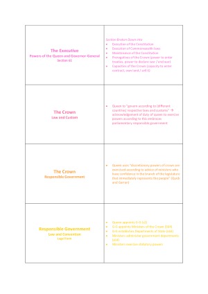 Completed notes with included case summaries from weeks 1-13 for Principles of Public Law in palm card study note form. Colour co-ordinated for ease of learning and to break up topics. Topics Include: constitution I (history), constitution II (structure), parliament I (queen, senate and house of representatives), parliament II (electoral franchise and qualifications of candidates), executive I (laws, conventions and responsible government), executive II (government accountability), judiciary I (judicial independence and federal courts), judiciary II (judicial independence, personae designatae and state courts), human rights I (constitutional rights - the implied freedom of political communication) and human rights II (options and reform)
