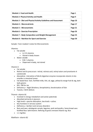 This set of notes covers the entire course content for 8 modules: - Food and health - Physical activity and health - Diet & Physical activity guidelines and assessment - Macronutrients - Micronutrients - Exercise prescription -Body composition, weight management and chronic disease - Nutrition and exercise performance for athletes The notes answer a wide range of study questions relating to the lectures and readings, and includes links to resources for UQ students.