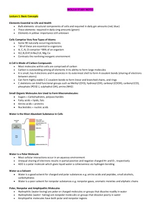 These notes are an in depth summary of lecture material, relevant textbook information and extra information given by the lecturer. Topics covered: 1. Basic concepts 2. Glycolysis 3. TCA cycle 4. Oxidative Phosphorylation 5. Gluconeogenesis and metabolism 6. Lipid and Fatty Acids 7. Ketones, Lipid Hormones and Vitamin 8. Nitrogen Metabolism 9. Nucleotides 10. Photosynthesis These study notes were extremely helpful for the final exam ! :)
