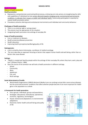 These notes are a summary of lecture notes, textbook information, tutorial notes and extra notes given by the lecturer. Topic included: History of health promotion Milestones in health promotion Critical Thinking Health Promotion approaches Health Promotion settings Health Promotion Theories and Models Health Promotion Theories and Strategies Health Promotion Theory and Health Literacy Measurement of Diet and Health Promotion Food composition Databases Validity and Reliability Assessing Dietary Intake Innovation methods to measure dietary intake Standards and recommendations for intake Anthropometry and body composition Biomarkers of Dietary intake Physical Activity Guidelines and Assessment Current trends