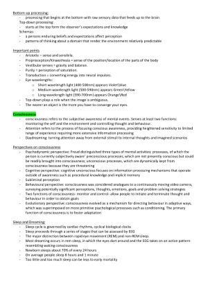 These notes are a summary of lecture notes, relevant textbook information and extra information given by the lecturers. These notes cover the entire semesters content :) Topics covered: Stress, coping and health Abnormal Psychology Conditioning and learning Memory and Cognition Sensation and Perception Intelligence Motivation and emotion Biological basics of psychology Consciousness