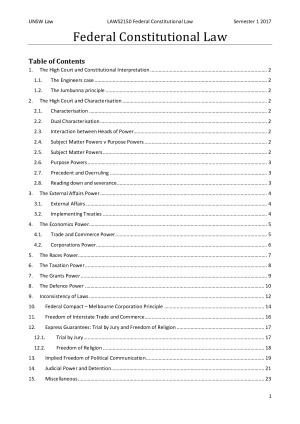 1. The High Court and Constitutional Interpretation 2. The High Court and Characterisation 3. The External Affairs Power External Affairs Implementing Treaties 4. The Economics Power Trade and Commerce Power Corporations Power 5. The Races Power 6. The Taxation Power 7. The Grants Power 8. The Defence Power 9. Inconsistency of Laws 10. Federal Compact – Melbourne Corporation Principle 11. Freedom of Interstate Trade and Commerce 12. Express Guarantees: Trial by Jury and Freedom of Religion Trial by Jury Freedom of Religion 13. Implied Freedom of Political Communication 14. Judicial Power and Detention