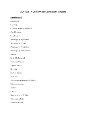 A compilation of all relevant cases (~135) within in the purview of the Contracts course, broken down into their respective areas. Each case has a full citation, and one or two sentences with the principles from the cases and their facts. Order of areas on the list follow the course progression. Invaluable as a study material and memory tool, as well as a quick reference for open book exams. Using this as a reference, received an HD in the final exam.