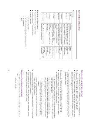TOPIC SUMMARIES: (saved as 2 pages per sheet) Collated topic summaries for each week which includes: - summaries of topics and concepts - case summaries (including simplified facts, the court decision, and key principle) - answer guideline for key problem question topics Easy to follow and includes clarifications pertinent to answering exam questions throughout. Perfect for a comprehensive overview of the Unit's topics I took this with me in the exam as a back up to my EXAM SCRIPT. I received a HD upon completion of the unit. TOPICS INCLUDE: Right to terminate: - Under contract agreement - For Breach - Of condition - Substantial breach of an intermediate term - For repudiation - Restrictions - Consequences Remedies: - Damages - Measure - Limitations - Specific Performance -Injunction - Action for debt - Liquidated damages or Penalty? - Restitution (with basis of unjust enrichment) - Frustration - Test - Consequences Vitiating Factors - Misleading and Deceptive Conduct - Duress - Undue Influence - Unconscionable Conduct - 3rd party impropriety - Statutory Unconscionable Dealing - Remedies Disclaimer: Whilst I did my best to collate these notes, making them as accurate as possible, I do not guarantee or claim that they are faultless!