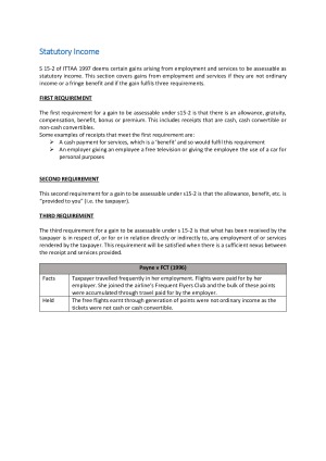 These notes summarise the topics in Taxation Law and is really useful for the exam. All legislation and cases are included. Topics include: Overview of Australian Taxation Laws GST Income Tax Statutory Income Ordinary Income Isolated and Extraordinary Transactions Capital Gains Tax Residence and Source Deductions Fringe Benefits Tax
