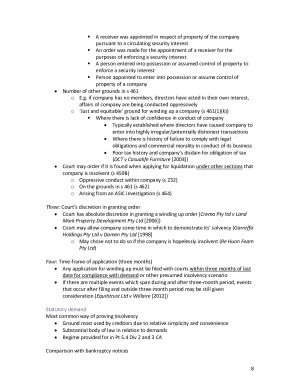 Distinction notes and answer guides with the following topics: - Introduction - Liquidation (inc. voluntary, provisional, assets available, criminal offences and civil actions, termination and deregistration) - Receivership (inc. appointment, role, powers and duties of receiver) - Voluntary administration (inc. process, role and powers of court, liquidation, DOCA) - Schemes of arrangements