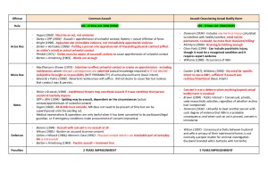 JURD7122 CRIMINAL LAWS TABLES FOR FINALS - Comprehensive and concise tables for offences and defences covered in JURD7122 Criminal Laws - Easy to read format with clearly labelled tables - 1-2 pages (max) each per offence/defence - UP TO DATE S2, 2018 OFFENCES COVERED: - Common Assault - Assault Occasioning Actual Bodily Harm (AOABC) - Negligent Grievous Bodily Harm (GBH) - Reckless Wounding/GBH - Intentional Wounding/GBH - Murder/Constructive Murder - Manslaughter (Voluntary, Criminal Negligence, Unlawful and Dangerous Act) - Homicide by Omission - Causation - Medical Treatment - Fraud/Dishonesty - Larceny - Robbery/Break and Enter - Receiving Stolen Property - Goods in Custody - Joint Criminal Enterprise (JCE) - Extended JCE - Accessorial Liability - Conspiracy DEFENCES COVERED: - Insanity/Mental Illness - Substantial Impairment - Automatism (Sane/Insane) - Intoxication - Self-Defence (Battered Women Syndrome) - Extreme Provocation (Policy Considerations)